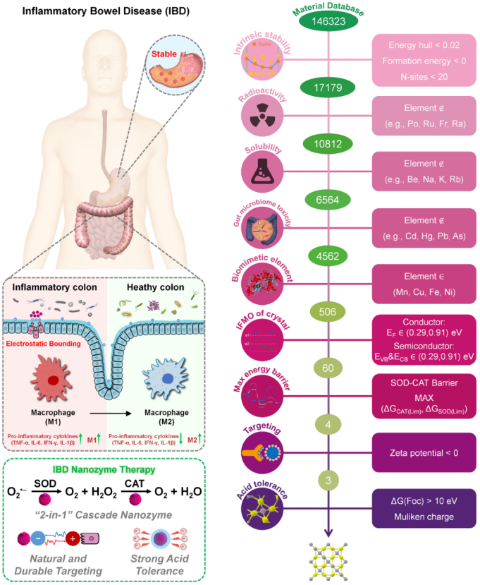 炎症性肠病(IBD)是一种慢性胃肠道炎症疾病,具有无法治愈和反复发作的特点,主要影响青壮年群体。然而,目前的临床治疗方法存在疗效有限的问题,并且可能引发严重的并发症、耐药性以及长期的免疫相关不良事件。纳米催化医学的发展为调节活性氧(ROS)相关炎症的氧化还原稳态提供了新途径。其中,抗氧化纳米酶是最具吸引力的和最有效的IBD治疗方案之一,它有助于缓解肠道氧化应激,同时抑制炎症对患者肠道微生物群的损害。虽然类超氧化物歧化酶(SOD)纳米酶能够清除ROS,如•OH和H2O2,但它与类过氧化氢酶(CAT)纳米酶形成的级联纳米酶系统(SOD-CAT)具有更强的抗氧化作用。除此之外,由于IBD的独特病灶和发炎结肠组织的特性,口服给药需要纳米药物具有高耐酸性和对带正电的发炎粘膜的靶向特异性。尽管已经报道了几种具备这些特性的纳米酶用于IBD纳米酶疗法,但大多数是通过经验或试错方法设计的,因此需要较长的开发时间和较高的成本。此外,多特征纳米酶通常表现出活性不足和相互制约的多酶活性。因此,有必要合理设计用于IBD治疗的纳米酶。随着计算化学的发展,基于量子力学/热力学方法的分子模拟为在原子尺度上解析纳米酶的构-效关系提供了可能。这些模拟方法能够从催化机理中推导出与材料性能相关的筛选判据,并利用材料数据库和高通量筛选技术开发出具有目标性能的材料。然而关于多酶活性筛选判据的研究尚未见报道,在高通量筛选中如何将纳米酶的不同特征与各种IBD治疗需求相结合更是完全未知。