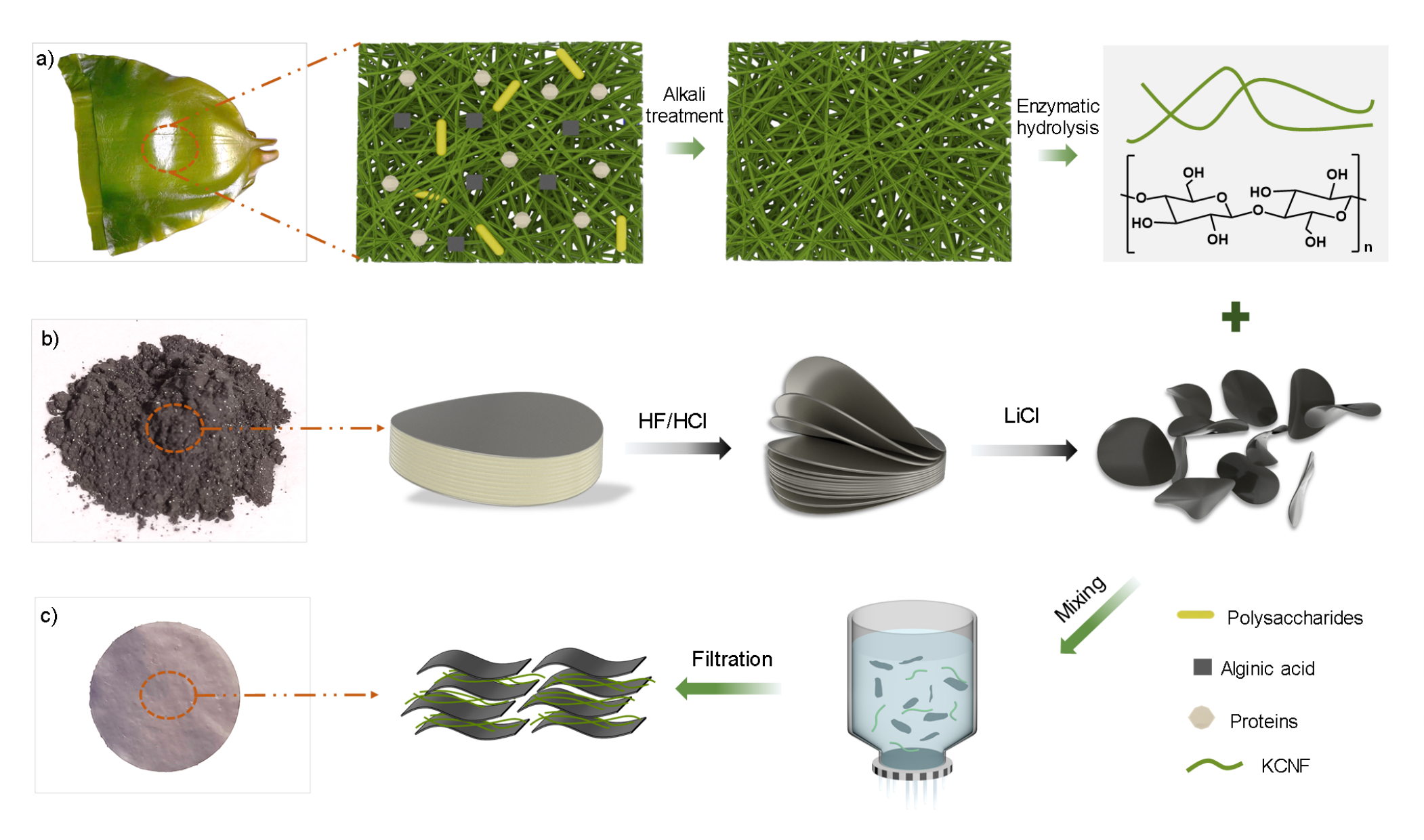 同时,考虑到合成纤维的成本昂贵、不易获得等弱点,为此,滕超副教授将目光投向自然界,寻找一种生长周期短、储量丰富、易于获得的天然海带,将提取的带负电海带纳米纤维与MXene纳米片复合,制备力学性能提高、溶液稳定的KCNF/MXene纳米复合材料,实现高效盐差能量捕,相关工作以题为“Kelp Nanofiber-Based Composite Membranes for Highly Efficient Osmotic Energy Conversion”的研究性论文发表在国际著名期刊Advanced Functional Materials上(2023,DOI: 10.1002/adfm.202313914,accepted)。365完美体育材料学院2021级硕士研究生翟瑞为本文的第一作者,滕超副教授为通讯作者。