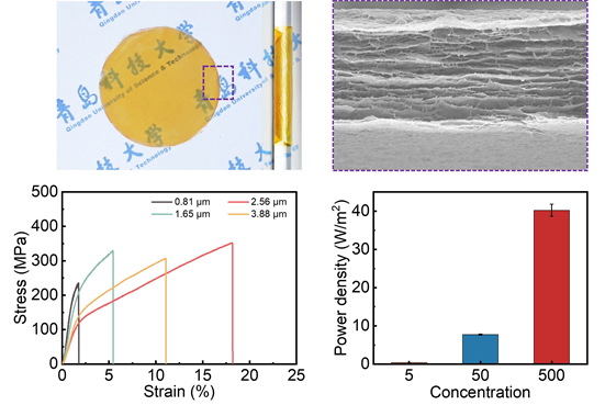 针对上述问题,材料学院滕超副教授长期致力于高性能复合材料在盐差转领域的应用研究,并于近期发表4篇相关高水平论文。首次将聚对苯撑苯并二噁唑(PBO)纳米纤维薄膜用于高性能的盐差能量捕获,成功揭示并证明PBO纳米纤维薄膜具有极好的力学性能和表面电负性,赋予薄膜长期稳定性的发电性能。相应成果发表在国际知名期刊Advanced Functional Materials上(Advanced Functional Materials, 2023, https://doi.org/10.1002/adfm.202311258);同时课题组进一步将带负电PBO纳米纤维与带负电MXene纳米片复合,构筑高性能纳米复合材料,获得极好离子选择性的渗透能转化器件,该工作发表在材料领域权威杂志Nano Letters上(Nano Letters, 2023, https://doi.org/10.1021/acs.nanolett.3c03343)。