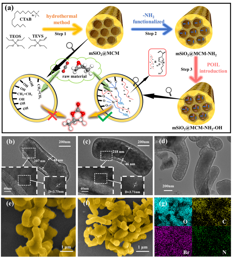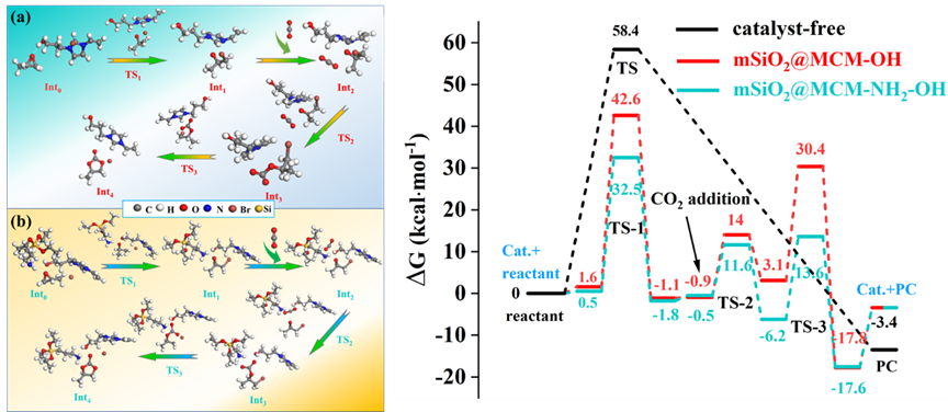 基于实验结果和密度泛函理论(DFT)计算,课题组提出了mSiO2@MCM-NH2-OH催化CO2环加成反应可能的机理。在反应初始阶段,催化剂中的-OH和-NH2基团通过氢键激活环氧化物。随后,由于溴离子的亲核攻击,环氧化物发生开环。由-NH2激活的CO2在催化剂作用下形成了一种氨基甲酸酯中间体,该中间体对开环中间体进行电子亲攻击,形成烷基碳酸酯中间体。最后,碳酸酯的O-与C-Br碳之间的反应导致碳环闭合完成CO2环加反应。此发现不仅揭示了CO2环加成反应的详细步骤,而且提供了一种高效的催化路径,有助于环境友好型化学品的合成,对于提升工业生产效率、降低环境污染具有重要意义,标志着我们在可持续化学领域迈出了重要一步。