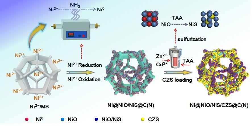 此外,课题组还提出了一种三聚氰胺海绵NH3还原策略,用于向C(N)骨架中的NiS/CdZnS催化体系引入新型Ni@NiO空心结构,制得Ni@NiO/NiS/CdZnS@C(N)催化剂。三聚氰胺海绵具有充当催化剂载体和还原剂的双重作用。光化学实验表明,Ni@NiO/NiS/CdZnS@C(N)的产氢速率为34456 μmol h−1g−1,是原始CdZnS (9126 μmol h−1g−1)的3.78倍。Z-scheme优化了光催化剂的电子分布,从而提高了NiS/CdZnS催化体系的电子传递效率。基于DFT计算,提出了一种Ni@NiO/NiS/CdZnS@C(N)裂解水制氢气可行的反应机理。结果表明,NiO的吉布斯自由能∆GH*仅为-0.36 eV,有利于H2的生成。此外,Ni@NiO/NiS/CdZnS@C(N)在费米能级附近表现出增强的DOS,表明其电子传递性能得到了显著改善。