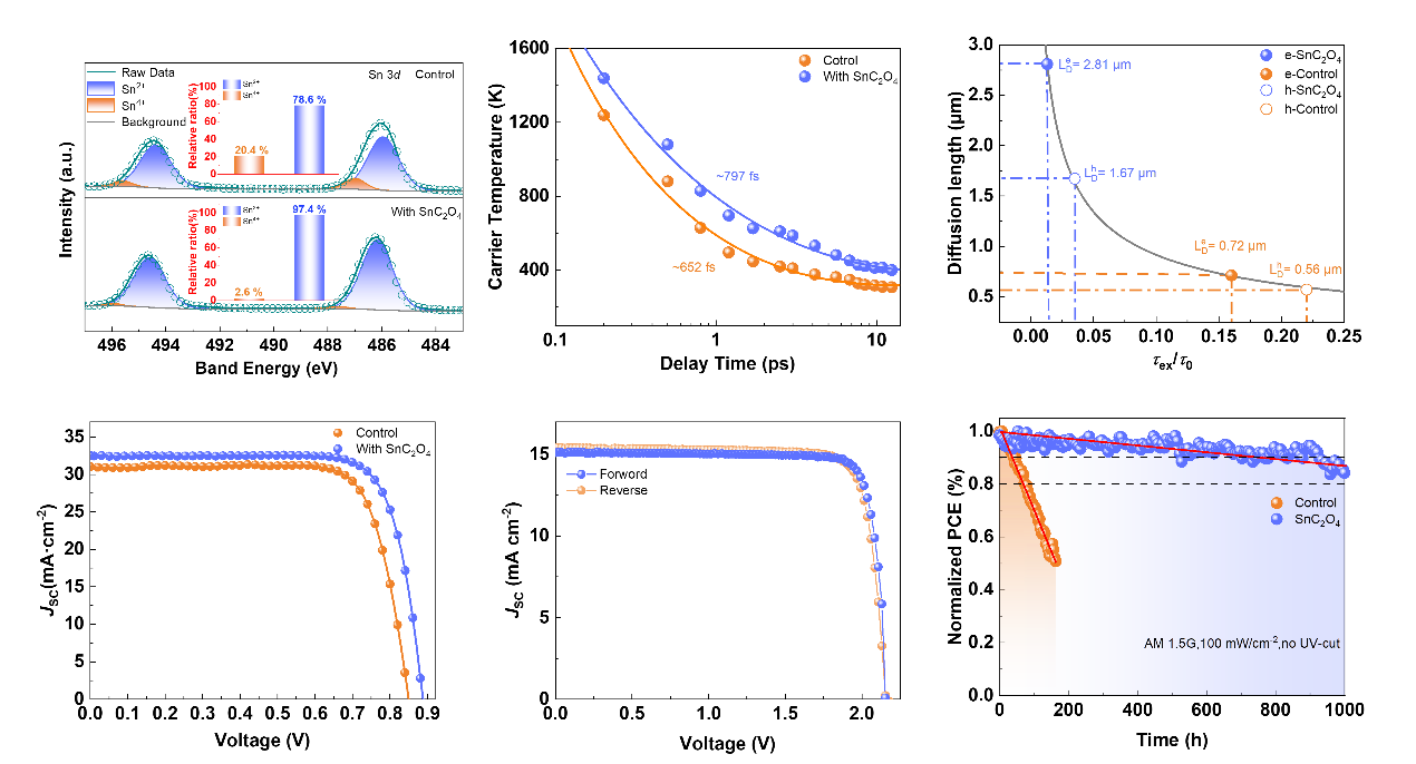 化学院周忠敏团队与合作者报道了将草酸锡(SnC2O4)引入锡铅钙钛矿前驱体溶液中以调节热载流子冷却动力学。SnC2O4的添加增加了载流子扩散的长度,延长了载流子的寿命,同时减缓了载流子的冷却速度。此外,SnC2O4可以与不配位的Sn2+和Pb2+离子结合,调节钙钛矿的结晶并实现大晶粒。C2O42-的强还原性可以抑制Sn2+氧化成Sn4+,并最大限度地减少所得钙钛矿薄膜中Sn空位的形成。此外,作为氟化锡(II)的替代品,SnC2O4的引入避免了由于F-离子在界面聚集而引起的载流子传输问题。