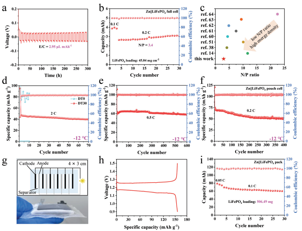 针对以上问题,刘杰副教授团队通过电解液的设计与优化,有效地稳定了锌负极/电解液界面,提升了水系锌离子电池的电化学性能,在Small Methods和Advanced Science杂志上发表高水平学术论文。前期,三聚磷酸钾无机低聚物被研发为三功能的电解液添加剂,不仅在锌负极表面自发形成了一层离子传导和机械强健的SEI层,而且调控了锌离子的沉积行为,有效地提升了锌负极的循环稳定性和可逆性,相关结果以“Tuning the Electrode/Electrolyte Interface Enabled by a Trifunctional Inorganic Oligomer Electrolyte Additive for Highly Stable and High-Rate Zn Anodes”为题发表在国际知名杂志Small Methods上(影响因子:12.4)。尽管如此,微量的电解液添加剂在长期循环过程中往往面临着消耗殆尽的问题。此外,微量的电解液添加剂仅能在局部范围内调控电解液中的氢键网络和锌离子配位结构。这导致实际工况下(贫电解液、低温、大容量等)水系锌离子电池的电化学性能快速衰退。近日,刘杰副教授团队将海藻糖开发为多功能共溶质以大规模调控水系电解液中的氢键网络结构和锌离子配位结构,借助分子动力学模拟、DFT理论计算、电化学测量方法等研究了海藻糖多功能共溶质的作用机制。如图1所示,海藻糖多功能共溶质有效地改善了水系锌离子电池在贫电解液、低负极用量、低温条件下的电化学性能,最终成功获得了LiFePO4载量为506.49 mg的Zn||LiFePO4电池包,表明了该电解液的实际应用潜力。该工作以“Massively Reconstructing Hydrogen Bonding Network and Coordination Structure Enabled by a Natural Multifunctional Co-Solvent for Practical Aqueous Zn-Ion Batteries”为题发表在国际知名杂志Advanced Science上(影响因子:15.1)。