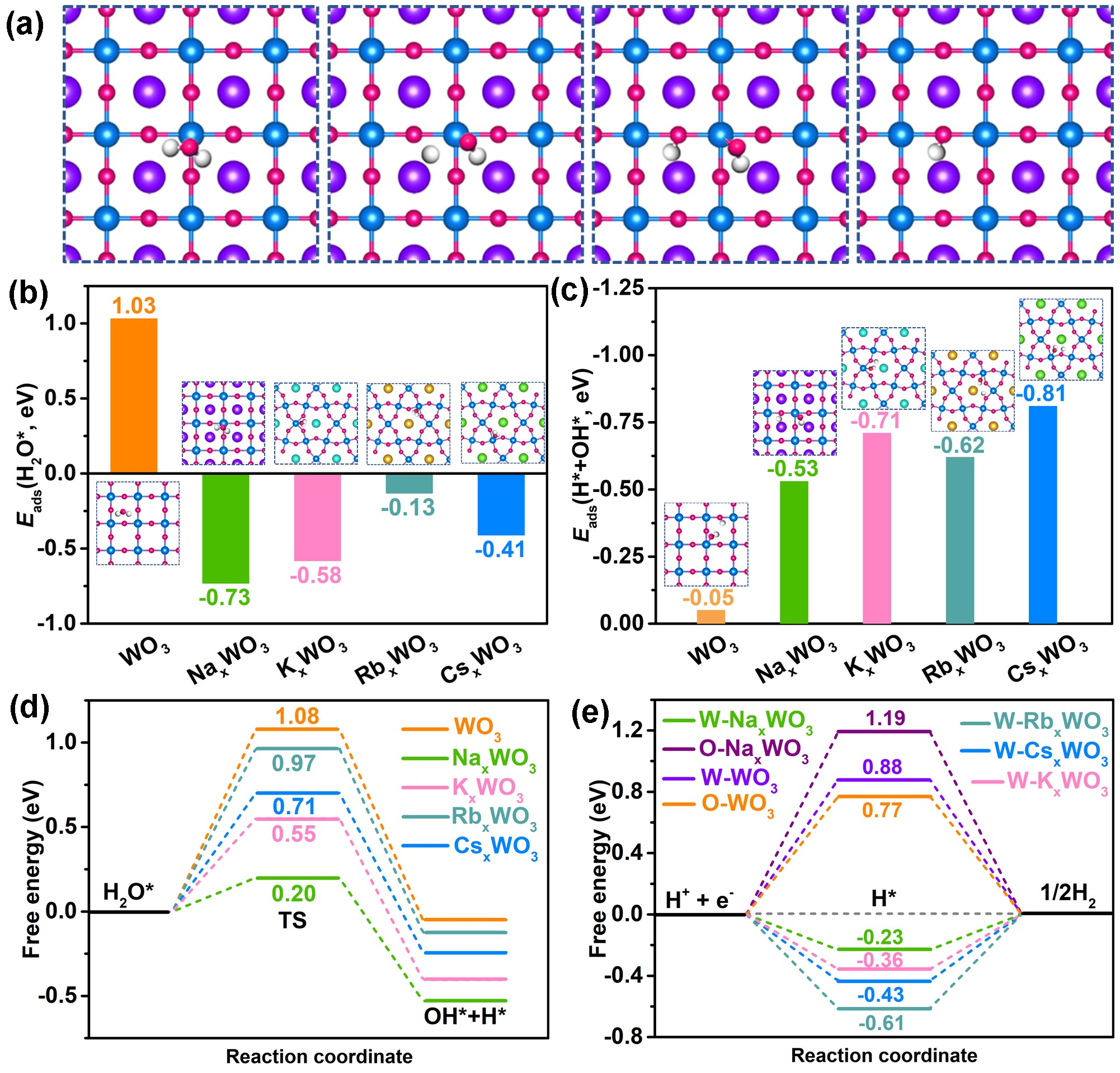 为满足各种电解槽对不同类型电解质的应用需求,设计开发能够在宽pH范围内具有优异析氢活性和稳定性的非贵金属电催化剂具有重要意义。最近,本团队首次开发了一种新型高效的非贵金属基全pH析氢催化剂——钠钨青铜多孔八面体(图1)。该催化剂能够在酸性、碱性和中性海水电解质中均具有类似商业铂碳催化剂的析氢活性,在10 mA cm-2时的过电位仅分别为37、48和256 mV(图2)。DFT计算表明,Na离子的引入使NaxWO3具有最优的电子结构和金属导电性,进而促进了水的吸附/解离动力学和氢吸附自由能(图3)。该工作首次揭示了碱金属离子在钨青铜中电催化析氢反应中的作用机理,有望为析氢反应和其他能量储存与转化反应催生一类新的非贵金属催化剂。上述成果发表于国际知名期刊Nano Energy(中科院1区TOP期刊,影响因子16.7),刘光波副教授为论文第一作者,姜鲁华教授为论文通讯作者,365完美体育为论文第一完成单位。