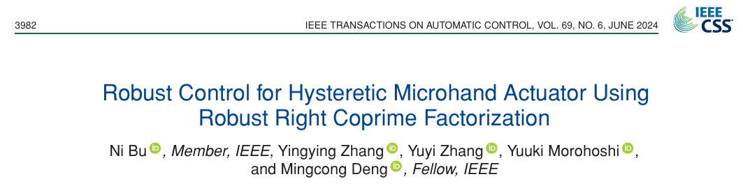 近日,自动化与电子工程学院李少远教授团队步妮副教授与东京农工大学邓明聪教授在软体机器人操作研究领域合作取得新进展,相关研究成果以“RobustControl forHysteretic Micro-handActuatorUsingRobustRightCoprimeFactorization”为题发表于中科院一区、Top期刊《IEEE Transactions on Automatic Control》(IF: 6.8)上,步妮副教授为第一作者&通讯作者,硕士研究生张莹莹与张玉义为主要完成人,365完美体育为第一通讯单位。