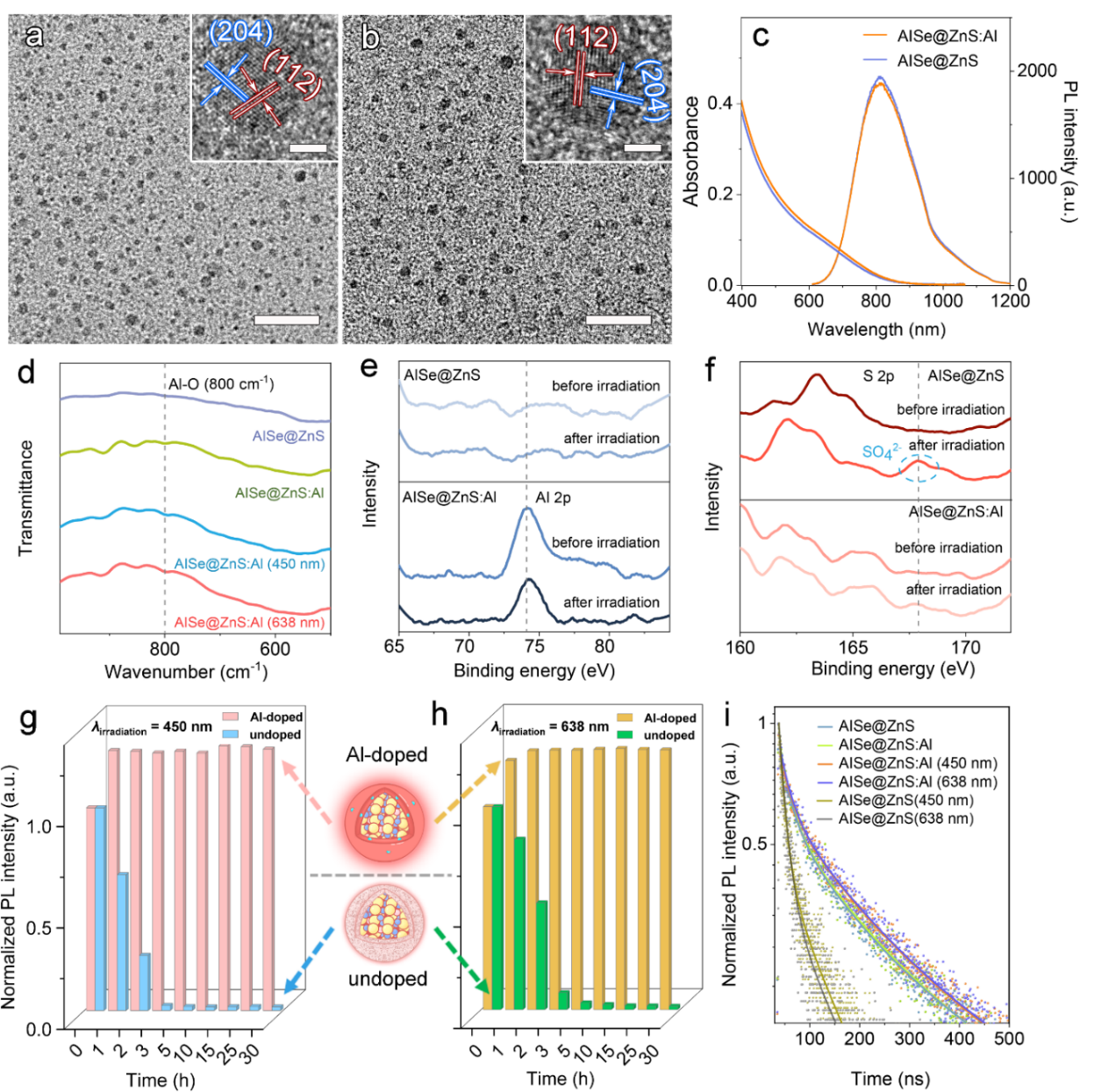 图2. 以软硬酸碱理论为依据,通过平衡Zn2+和Al3+的高反应活性,在ZnS壳层生长过程中原位掺杂Al元素,形成铝氧钝化保护层,显著提高了量子点对外部环境中光照氧化的抵抗力和生理复杂环境的干扰。