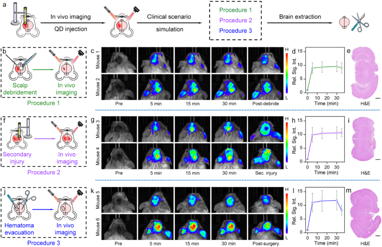 为了进一步验证基于量子点的光学成像策略在TBI临床管理中的实际应用价值,本工作模拟了三种常见的临床场景:1)颅内和浅表出血;2)继发性出血;3)颅内血肿手术清除,并通过量子点进行实时可视化检测。在体成像结果表明,通过近红外光学成像,可以显著区分损伤是否位于颅内,实时监测二次出血的发生位置和范围,并确认血肿是否被有效清除(图4)。