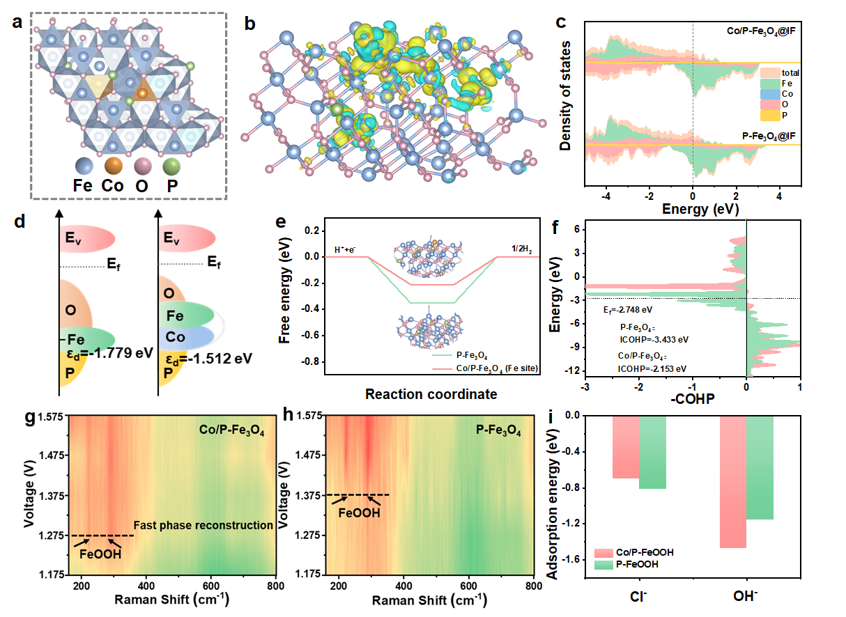 随后,王磊教授团队采用熔融盐与气相磷化相结合的策略构建了Co/P双掺杂双功能催化剂(Co/P-Fe3O4@IF),实现了Fe3O4中电子的再分布。其中,磷化过程促进了Fe2O3向反尖晶石Fe3O4相的转化,加速了H2O的解离。同时,Co掺杂操纵Fe3O4中的电子分布,调控d带中心,在优化ΔGH*的同时促进了OER的重构过程。在碱性海水AEM电解槽中,该催化剂在1.83 V电压下可以达到500 mA cm-2的电流密度,生产每立方米的氢气只需消耗4.38 KWh。(Appl. Catal. B: Environ., 2024, 357, 124269)