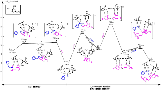 为了阐明EVP化学选择性开环聚合的机理,作者通过DFT计算对ROP和1,4-共轭加成二聚化路径进行了比较。如图5所示,BnO⁻(苄氧基阴离子)通过一个过渡态(TS1ROP)对EVP的羰基碳原子进行亲核攻击,其能垒(ΔG‡ROP)为11.4 kcal·mol⁻¹,生成中间体(INT1ROP)。随后,EVP的开环通过TS2ROP发生,形成INT2ROP,释放能量4.3(11.1 - 6.8)kcal·mol⁻¹,其中通过DU8分子的氢键相互作用稳定了EVP开环产生的新甲氧基阴离子链末端。对于1,4-共轭加成二聚化路径,EVP的甲基上的一个氢被BnOH的BnO⁻捕获,克服能垒16.2 kcal·mol⁻¹的过渡态TS1dim,进一步脱去一个苄基醇并重排生成中间体INT1dim。中间体INT1dim通过TS2dim攻击第二个EVP分子的亚甲基碳原子,克服11.7(20.6 - 8.9)kcal·mol⁻¹的能垒,生成二聚体INT2dim。此外,通过TS3dim引入苄基醇,生成包含EVP二聚体的络合物INT3dim,其能垒为2.6(8.2 - 5.6)kcal·mol⁻¹。相比之下,ROP路径需要克服的自由能垒为11.4 kcal·mol⁻¹,比1,4-共轭加成二聚化路径(总能垒为20.6 kcal·mol⁻¹,ΔG‡dim)在动力学上更有利。