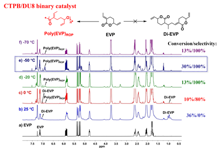 作者以CTPB/DU8为催化剂,首先研究了温度对化学选择性的影响(图3)。在25 °C时,快速发生1,4-共轭迈克尔加成,形成二聚物Di-EVP。研究发现,降低温度后ROP的选择性明显提高。在0 °C时,既有1,4-共轭迈克尔加成产物,也有ROP产物,表明两种反应同时发生。在-20 °C时,只发生ROP,EVP的转化率为13%。在-50 °C时,ROP选择性更高,8小时内EVP转化率达到30%。热力学测试结果表明,EVP的Tc为−136 °C(1 M)。由此说明,为了实现EVP的选择性ROP,需要在低温下进行。