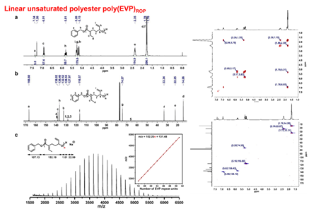 进一步,作者通过核磁1H,13C,1H−1H COSY、1H−13C HSQC和DEPT谱图,以及MALDI-TOF MS(图4)对线性poly(EVP)ROP聚酯的结构进行了表征。由此证明开发了一种具有两种不同不饱和官能团的CO2基聚酯。