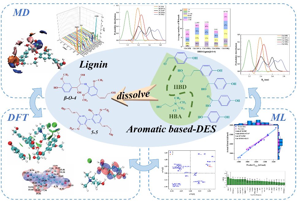 团队采用密度泛函计算、分子动力学模拟和多变量分析等方法,研究了5种芳香基DES与2种木质素二聚体模型的相互作用机理。探讨了溶解温度和芳香氢键给体类型对木质素β-O-4与5-5亚结构单元间连接键或与不同官能团相互作用的影响。在木质素溶解过程中,γ-OH是PB和Cl-作用于木质素二聚体(β-O-4)的首选位点,与γ-OH形成氢键的比例为40%。它分布在木质素二聚体(β-O-4)周围0.28 ~ 0.32 nm处,总相互作用能为-4041.1452 kJ/mol。相关研究成果以“Comprehensive analysis of lignin dimer dissolution microscopic mechanism in different aromatic-based deep eutectic solvent”为题目,发表在生物质化工研究领域国际知名期刊Industrial Crops & Products(SCI一区TOP期刊)。论文第一作者为化工学院2021级硕士研究生朱宝平和2022级硕士研究生葛瀚文,通讯作者为徐环斐,365完美体育为第一单位和唯一通讯单位。论文DOI链接为10.1016/j.indcrop.2024.119736。