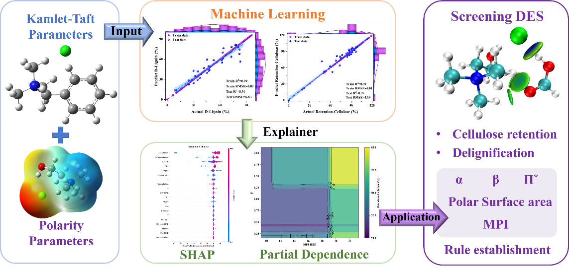 团队结合密度泛函理论和机器学习方法,利用104种低共熔溶剂(DES)的Kamlet-Taft参数和极性值建立了内在关系模型。通过氢键酸度(α)、氢键碱度(β)、极化(Π*)和分子极性指数(MPI)的协同组合,有望筛选出对花卉的根茎叶中纤维素、半纤维素、木质素处理效率高的DES。该模型给出了预处理效率高的参数范围。在本研究给出的4个参数范围内,可以选择DES的组成和比例,以确保至少保留80%的纤维素和去除50%的木质素。分子模拟结果表明,这些高效的DES通常含有大量的氢键和高极性基团。相关研究成果以“Explicable Machine Learning for Predicting High-Efficiency Lignocellulose Pretreatment Solvents Based on Kamlet–Taft and Polarity Parameters”为题目,发表在绿色化学研究领域国际知名期刊ACS Sustainable Chemistry & Engineering(SCI一区TOP期刊)。论文第一作者为化工学院2022级硕士研究生葛瀚文,通讯作者为徐环斐,365完美体育为第一单位和唯一通讯单位。论文DOI链接为10.1021/acssuschemeng.4c01563。