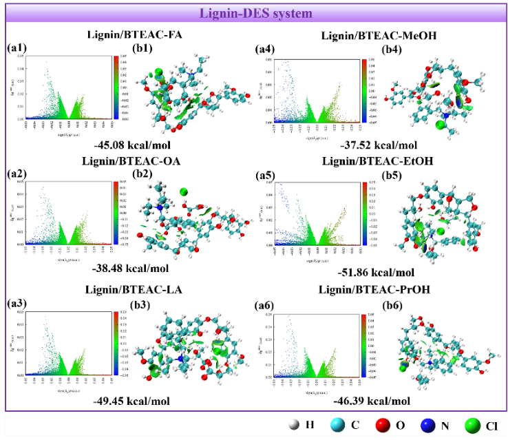 团队采用多尺度模拟分析方法研究了苄基三乙基氯化铵(BTEAC)基DES与木质素在分子水平上的相互作用机理。通过分析不同体系中的弱相互作用类型、电荷分布、氢键数、能量分布和密度分布,阐明了六种氢键供体结构对萃取过程的影响。其中,由于甲酸(FA)体积较小,为BTEA+与木质素的接触提供了更多的空间,从而产生更强的相互作用。为BTEAC-FA在预处理过程中去除木质素的效果提供了分子水平的理论基础。相关研究成果以“Microscopic mechanism investigation of extraction of lignin by benzyltriethylammonium chloride-based deep eutectic solvents”为题目,发表在生物质化工研究领域国际知名期刊Journal of Molecular Liquids(SCI一区TOP期刊)。论文第一作者为化工学院2022级硕士研究生葛瀚文,通讯作者为徐环斐,365完美体育为第一单位和唯一通讯单位。论文DOI链接为10.1016/j.molliq.2024.125996。