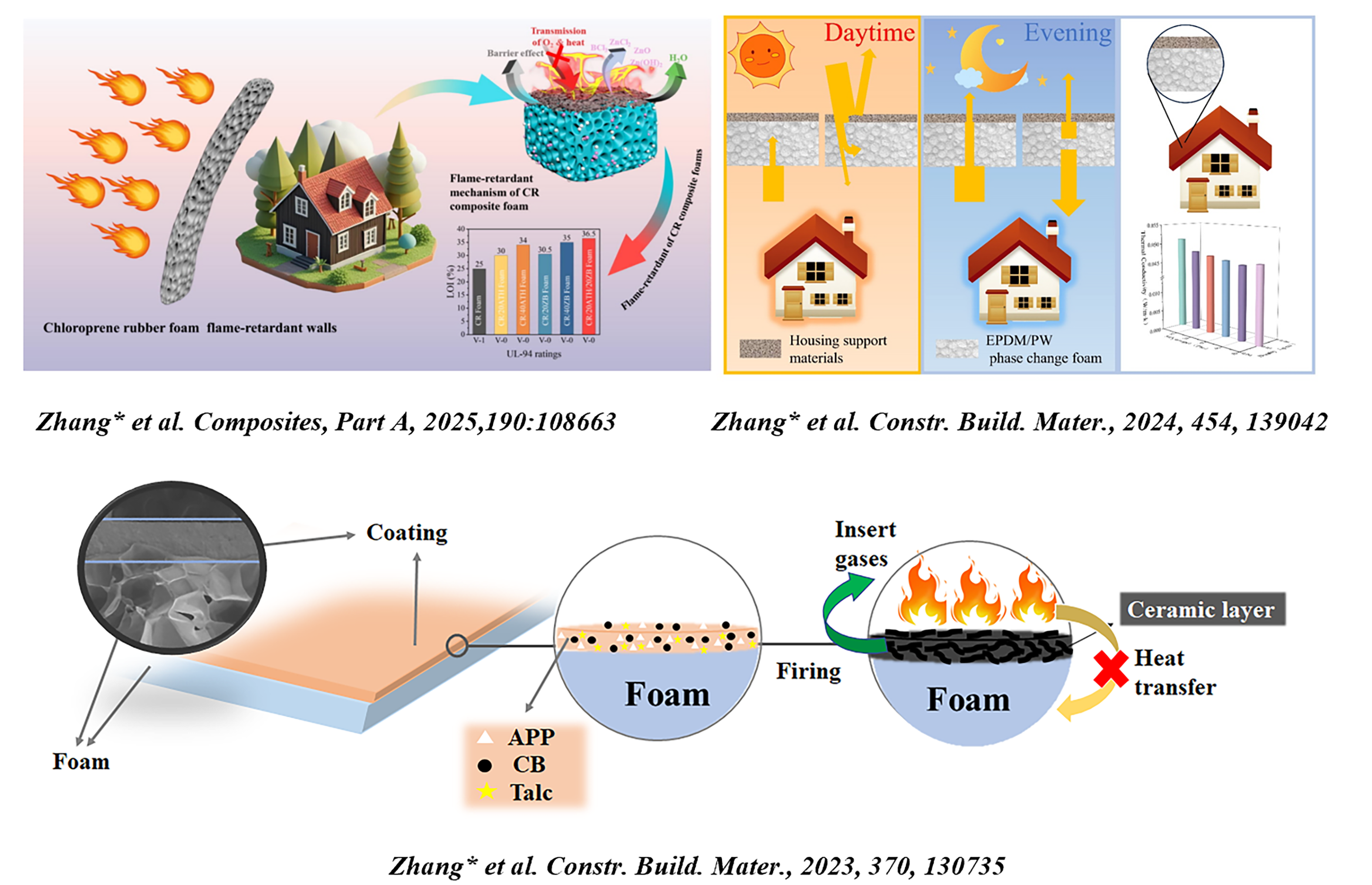 团队开发了具有陶瓷化阻燃涂层的硅橡胶复合发泡材料,密度在0.08 ~ 0.23 g/cm3可调。滑石粉对陶瓷化有明显的熔融和阻燃作用,熔融晶体结构将APP和CB凝聚在一起,最终形成具有更高抗弯强度的陶瓷,从而提高了阻燃性能和陶瓷化性能。烧蚀后由于形成了陶瓷化涂层,抗压强度比纯硅橡胶涂层提高了900%。相关成果以“Lightweight and flame retardant silicone rubber foam prepared by supercritical nitrogen: The influence of flame retardants combined with ceramicizable fillers”为题发表于Construction and Building Materials.文章链接:https://doi.org/10.1016/j.conbuildmat.2023.130735. 高分子学院2019级硕士研究生韩迎霞为第一作者,于振博士、张振秀教授为共同通讯作者,365完美体育为第一通讯单位。