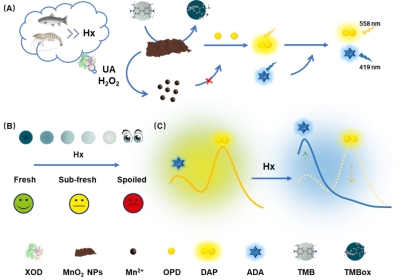 该研究设计了一种基于双分解机制的检测体系,通过简单催化反应实现双模式检测:比色模式仅需15分钟,适合现场快速评估;比率荧光模式则通过内置参比信号,有效降低复杂基质干扰,提升检测精度。成功应用于虾和鱼样品储存过程中新鲜度监测,表现出优异的灵敏度、特异性与重现性。此外,该研究揭示了次黄嘌呤在黄嘌呤氧化酶(XOD)催化下生成的双产物(H2O2与尿酸)可协同降解MnO2纳米片,进而调控其对底物TMB/OPD的催化反应,形成易于读取的颜色变化与荧光比率变化信号。特别是基于内滤效应构建的比率型荧光信号策略,克服了传统单信号检测受基质背景干扰大的局限,显著提升了检测的准确性与鲁棒性。