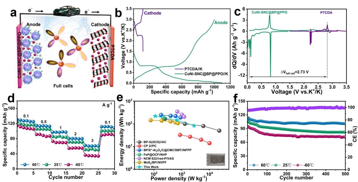 图5. a)全电池结构示意图,b)半电池的充放电曲线,c)相应的dQ/dV曲线,d) CoNi-SNC@BP@PPO//PTCDA的倍率性能,e) CoNi-SNC@BP@PPO//PTCDA的Ragone图,f) CoNi-SNC@BP@PPO//PTCDA全电池的循环性能。