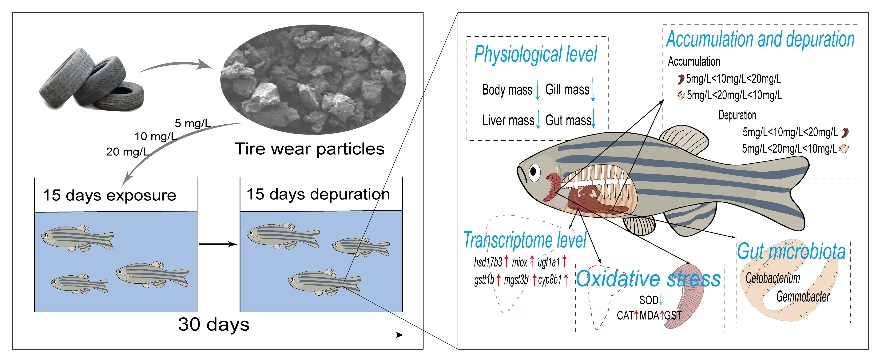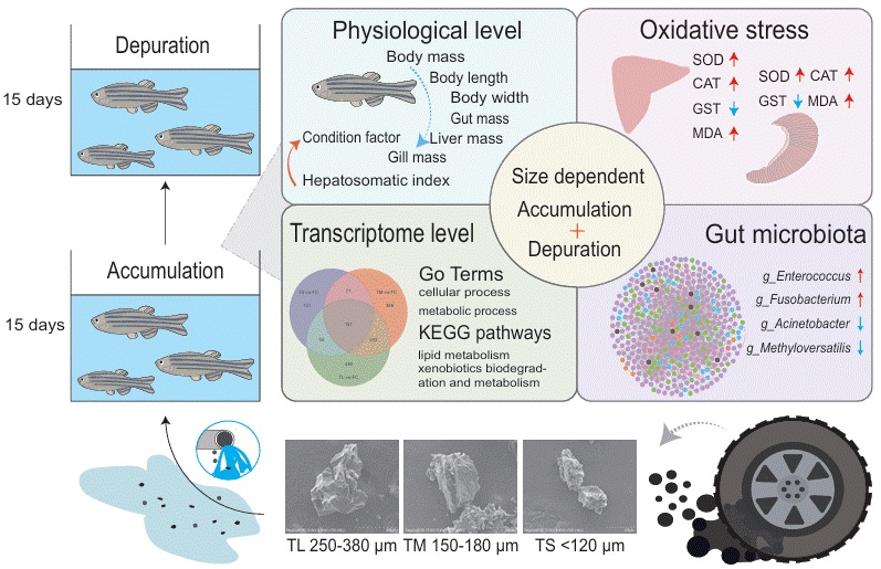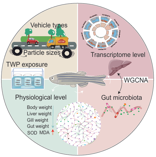 轮胎磨损颗粒(Tire Wear Particles, TWPs)是交通活动产生的重要微塑料污染物,广泛存在于土壤、水体和大气中,对水生生态系统的潜在威胁日益受到关注。然而,不同粒径、来源及浓度的TWPs在生物体内的毒理作用机制仍不清晰。为系统揭示TWPs的毒性规律及其对宿主与肠道微生物互作的影响,365完美体育生物工程学院丛静副教授指导张云、赵天宇、宋倩倩、孟庆轩等研究生,开展了一系列系统研究,并取得重要进展。