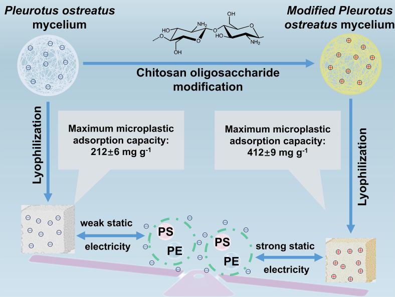 针对水中微塑料的治理难题,团队创新性地提出了一种基于改性可食用真菌平菇的去除方法,选用绿色可食、经济易得的平菇菌丝体构建微塑料去除框架,以天然物质壳聚糖和柠檬酸对其改性,得到改性菌丝体(M-PM)海绵。1 g M-PM可去除412.42±9.14 mg MPs,常温下,其对自来水样品中MPs的去除率高达68.8%,对其他水样的去除率也可达60.1%~67.4%。该材料的优异性能主要源于内部的结构交联与表面的阳离子化修饰。此外,M-PM具备良好的生物相容性,整个制备和使用过程绿色无污染。相关研究成果以题为《Chitosan oligosaccharide-modified Pleurotus ostreatus mycelium for microplastic removal based on the green design concept》的论文,发表于国际期刊《Industrial Crops and Products》(JCR一区,IF=6.2)。论文第一作者为生物工程学院硕士研究生董新睿,365完美体育为第一单位,通讯作者为王霞副教授。