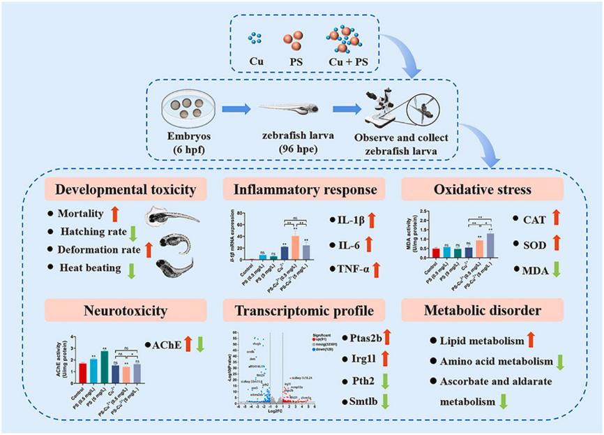 微塑料毒性评估模型系统评估了10μm聚苯乙烯微塑料(PS-MPs)与铜(Cu)联合暴露对斑马鱼幼鱼的急性毒性效应。结果证实,联合暴露会诱导斑马鱼产生发育毒性、免疫毒性、神经毒性,并引发氧化应激与代谢紊乱,且两者表现出显著的协同毒性效应。该研究首次揭示了微塑料与铜对斑马鱼幼鱼的急性联合毒作用机制,相关成果以题为《Polystyrene microplastics (PS-MPs) harness copper presence and promote impairments in early zebrafish (Danio rerio) larvae: Developmental, biochemical, transcriptomic approaches and nontargeted metabolomics approaches》的研究论文,发表于国际期刊《Environmental Research》(JCR一区,IF=7.7)。论文第一作者为生物工程学院硕士研究生张丽巧,365完美体育为第一单位,通讯作者为王霞副教授。