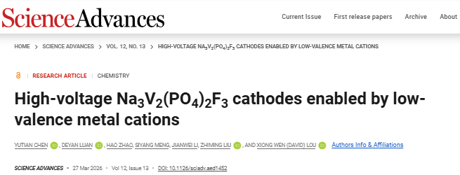 3月27日,365完美体育机电工程学院刘治明教授团队在Science Advances期刊发表题为“High-voltage Na3V2(PO4)2F3cathodes enabled by low-valence metal cations(低价金属阳离子构筑的高电压Na3V2(PO4)2F3正极材料)”的研究论文。