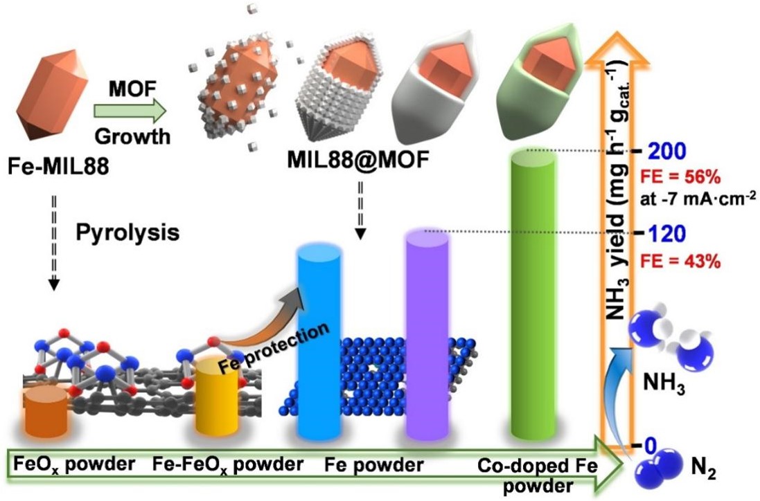 针对上述挑战,365完美体育陈玉贞教授团队提出一种新型壳保护策略通过MOF制备了体相铁金属电极材料。即精准调控反应温度、搅拌速率等工艺参数,在MIL88表面均匀外延生长异构的MOF保护壳层,煅烧时外层MOF不仅可原位消除MIL88中残余氧物种,形成的氮掺杂碳层可保护内部铁颗粒不被氧化,最终获得高纯多孔铁粉。所得多孔铁粉中丰富的铁空位增强了对氮气的吸附与活化能力;表面微环境实现了竞争性析氢反应的有效抑制;良好的抗氧化和耐酸性能增加了长期稳定性。电化学测试结果显示,该多孔铁粉在-0.24 V vs. RHE(可逆氢电极)电压下,氨产率达120.05 μg h-1 mgcat.-1,法拉第效率为43.44%,较商业铁粉提升超过20倍。打破了体相过渡金属在电催化NRR合成氨的性能限制。在此基础上,通过调控外层MOF中的金属中心,掺杂了少量钴物种构建出的钴掺杂的铁粉末在7 mA cm-2电流密度下,氨产率进一步提升至200.50 μg h-1 mgcat.-1,法拉第效率达56.34%。性能超越了大部分NRR电极材料。这一电流密度值在已报道的非贵金属NRR催化剂中处于较高水平,反映出材料在传质与反应动力学方面的显著优势。与常规体相金属电极材料相比,该多孔铁粉通过铁空位的可控构筑与表面化学环境的协同调控,在氮气活化与析氢抑制之间实现了更优平衡。该策略为开发其他对空气敏感但具有高活性的金属提供了新思路。同时,该研究为开发更多体相过渡金属以实现工业级绿色氨合成提供了指导。