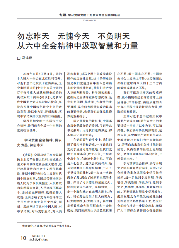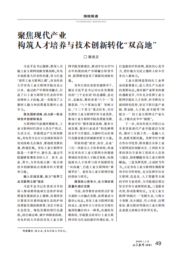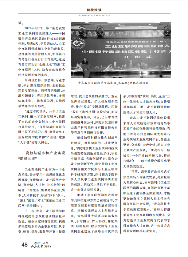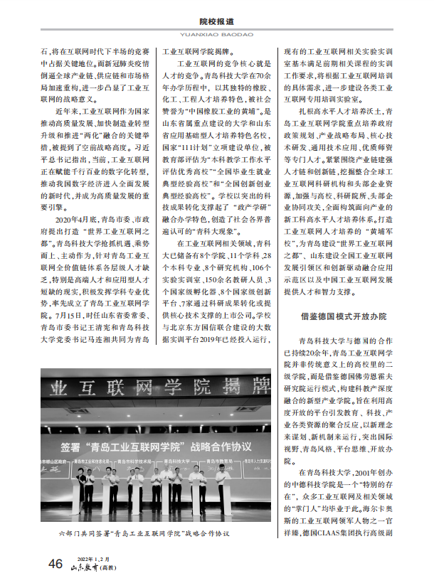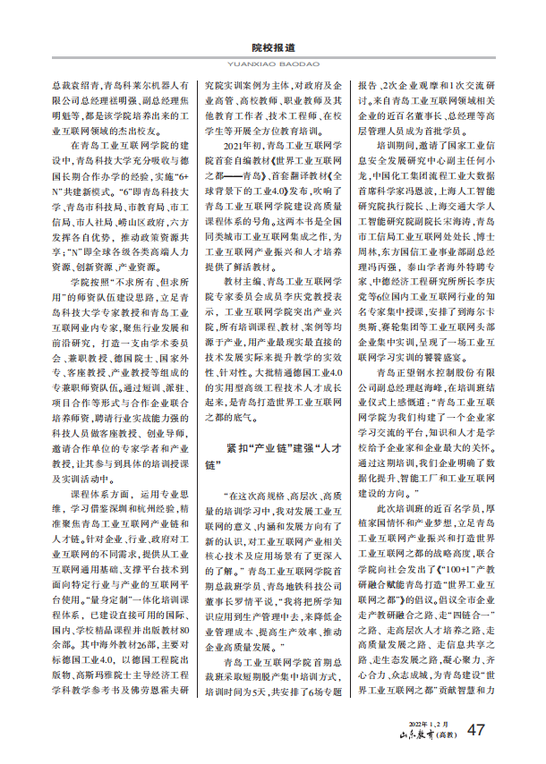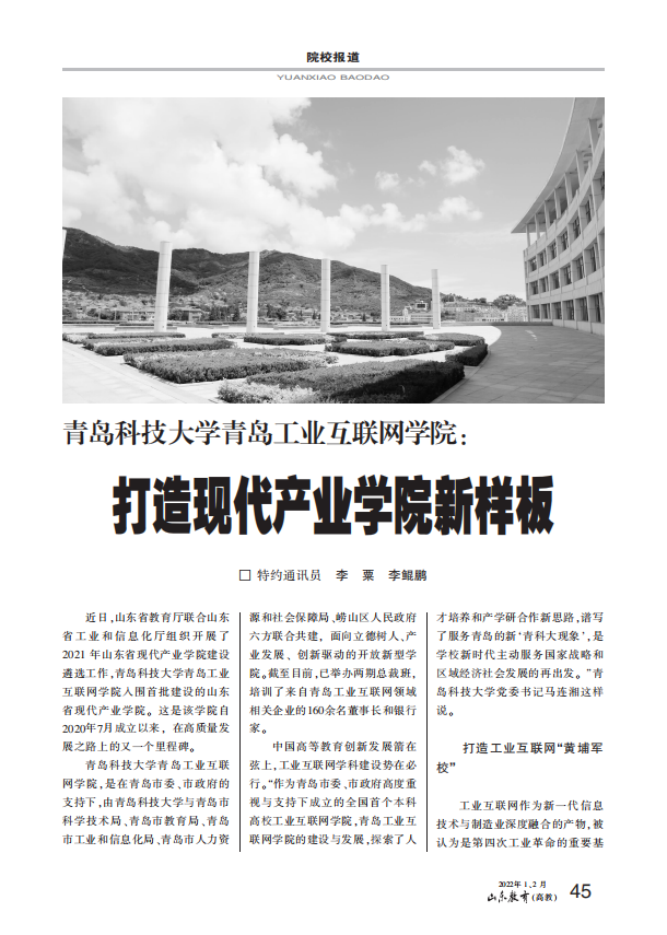 日前,《山东教育》(高教)2022年1、2月合刊刊发学校党委书记马连湘署名文章《勿忘昨天 无愧今天 不负明天 从六中全会精神中汲取智慧和力量》、校长陈克正署名文章《聚焦现代产业 构筑人才培养与技术创新转化“双高地”》。在“院校报道”版块以《365完美体育青岛工业互联网学院:打造现代产业学院新样板》为题,详细报道青岛工业互联网学院创建成效。