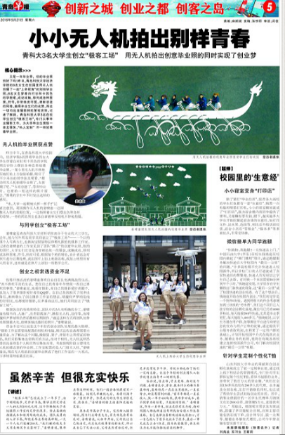 资金不足可以说是这个年轻的创业团队发展的最大阻碍。“摄影工作室需要高配置的相机和电脑,购买这些设备都需要大量资金。为了解决这个问题,像服装、架子、背景布之类便宜的物品,我们采取集体出资购买的方法,而对于相机、无人机这样昂贵的设备则是个人购买然后集体共用。考虑到现阶段主要用无人机拍摄近景的毕业照,工作室配置的是入门级无人机。”姜啸童说,现在无人机航拍创意毕业照成了他们工作室的一大亮点,许多师哥师姐慕名而来。