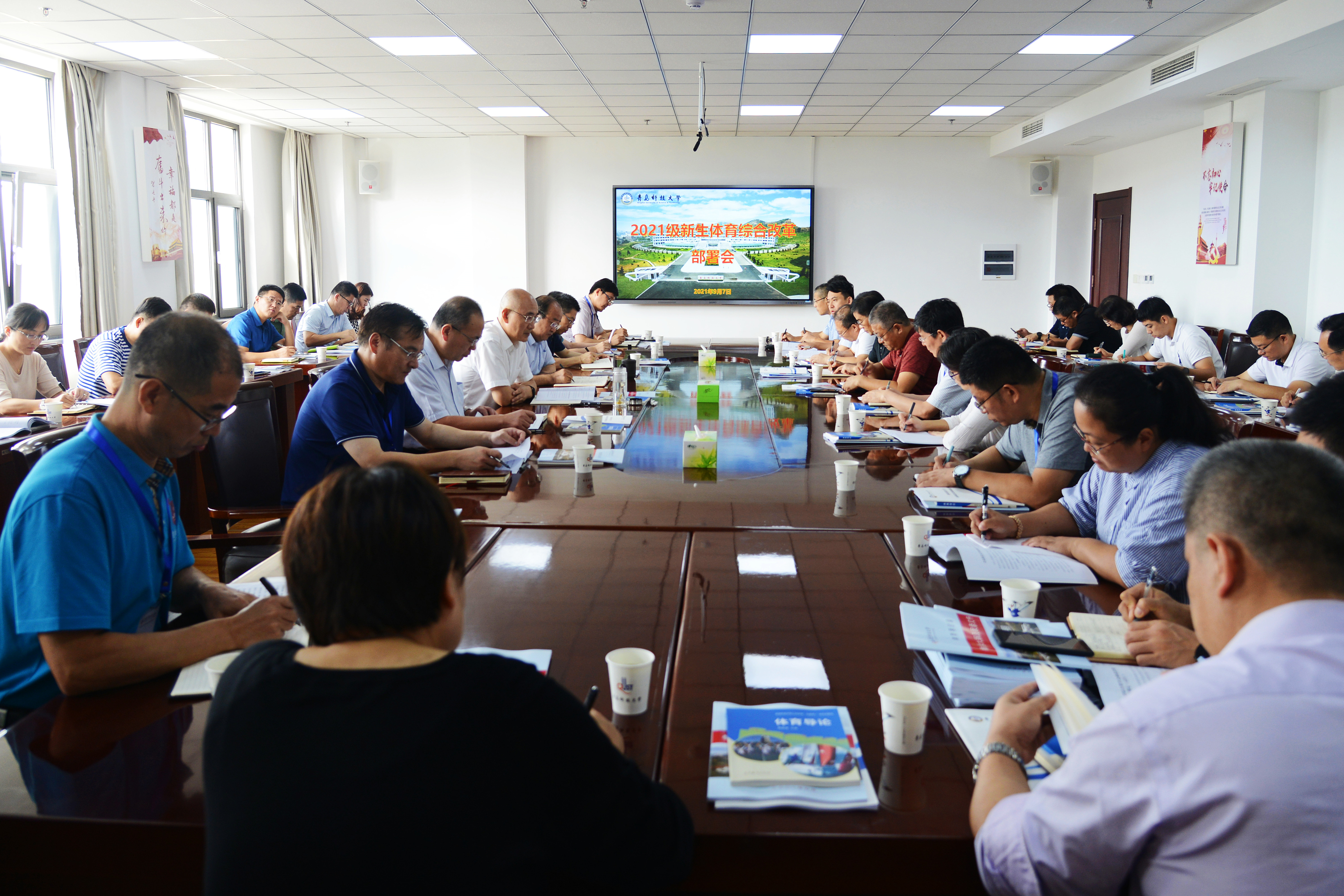 9月7日上午,学校2021级新生体育综合改革部署会在崂山校区综合服务楼3015会议室举行。校长陈克正,党委常委、副校长李勇、吕万翔、丁林,党委常委、宣传部部长陈刚出席会议。