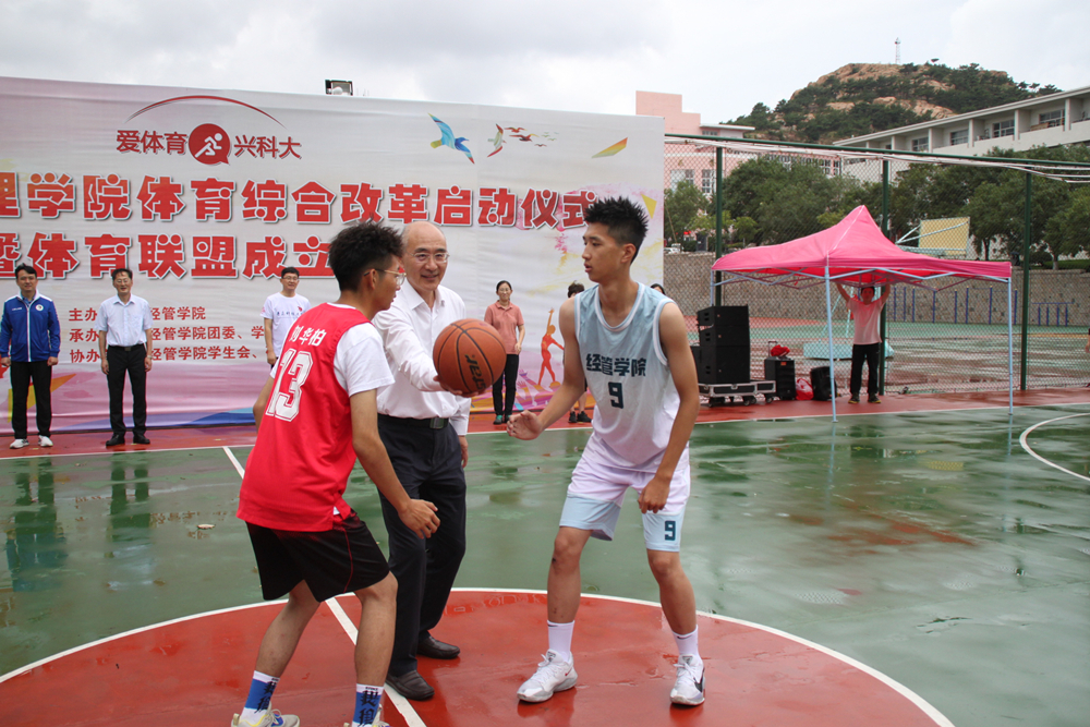 9月25日下午,学校首个院级体育联盟成立大会在崂山校区南苑篮球场举行,校长陈克正出席大会并为联盟篮球联赛开球。