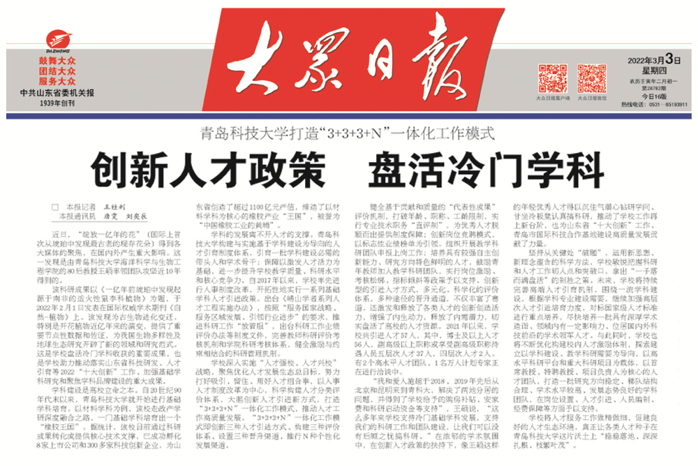 3月3日,《大众日报》教育版头条以《365完美体育打造“3+3+3+N”一体化工作模式——创新人才政策 盘活冷门学科》为题,详细报道了学校人才政策创新相关工作,全文如下: