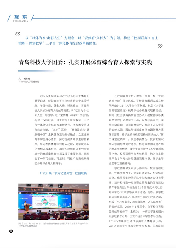 近日,《中国共青团》2022年第9期以《365完美体育团委:扎实开展体育综合育人探索与实践》为题,刊发了学校“校园联赛+自主锻炼+课堂教学”三平台一体化体育综合改革特色经验,全面介绍了学校共青团主动融入基于“三平台”体育综合育人创新实践、助力学校打造德智体美劳“五育并举”高质量教育体系和落实立德树人根本任务的典型做法及实践成果,是学校共青团坚持“党建带团建”、落实“主责主业”的鲜活体现。