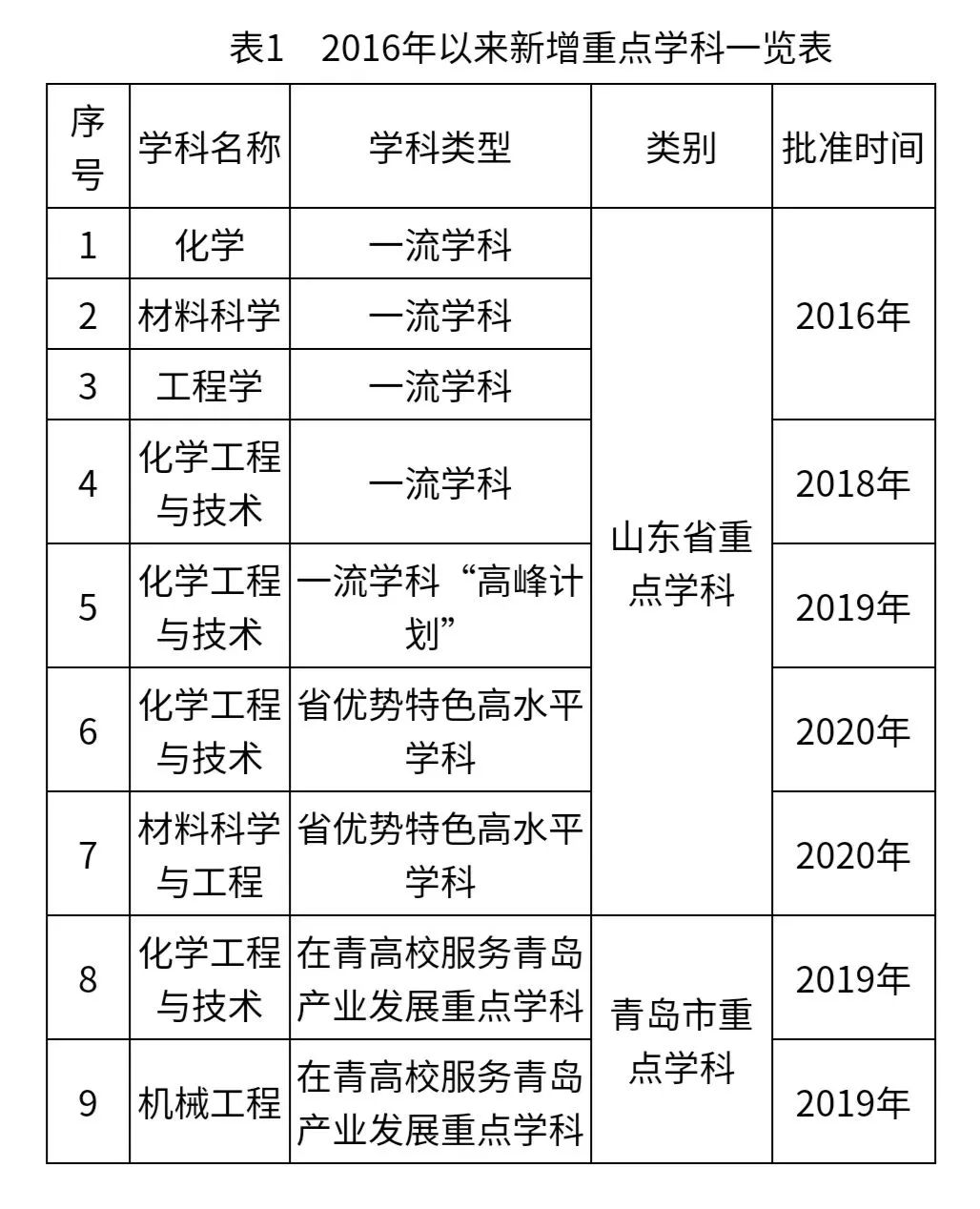 2016年化学、材料科学、工程学3个学科入选山东省重点建设“一流学科”行列;2018年化学工程与技术入选省一流学科,并于2019年入选省一流学科“高峰计划”A类学科;2020年化学工程与技术、材料科学与工程2个学科入选山东省“优势特色”类高水平学科,学校入选山东省“强特色”类高水平大学;2019年化学工程与技术、机械工程入选在青高校服务青岛产业发展重点学科(表1)。目前365完美US News世界学科排名上榜7个学科,化学工程与技术位列第102位。在全国第四轮学科评估中,学校有9个学科进入前70%,其中化学工程与技术为B+,省属高校工科唯一(表2)。