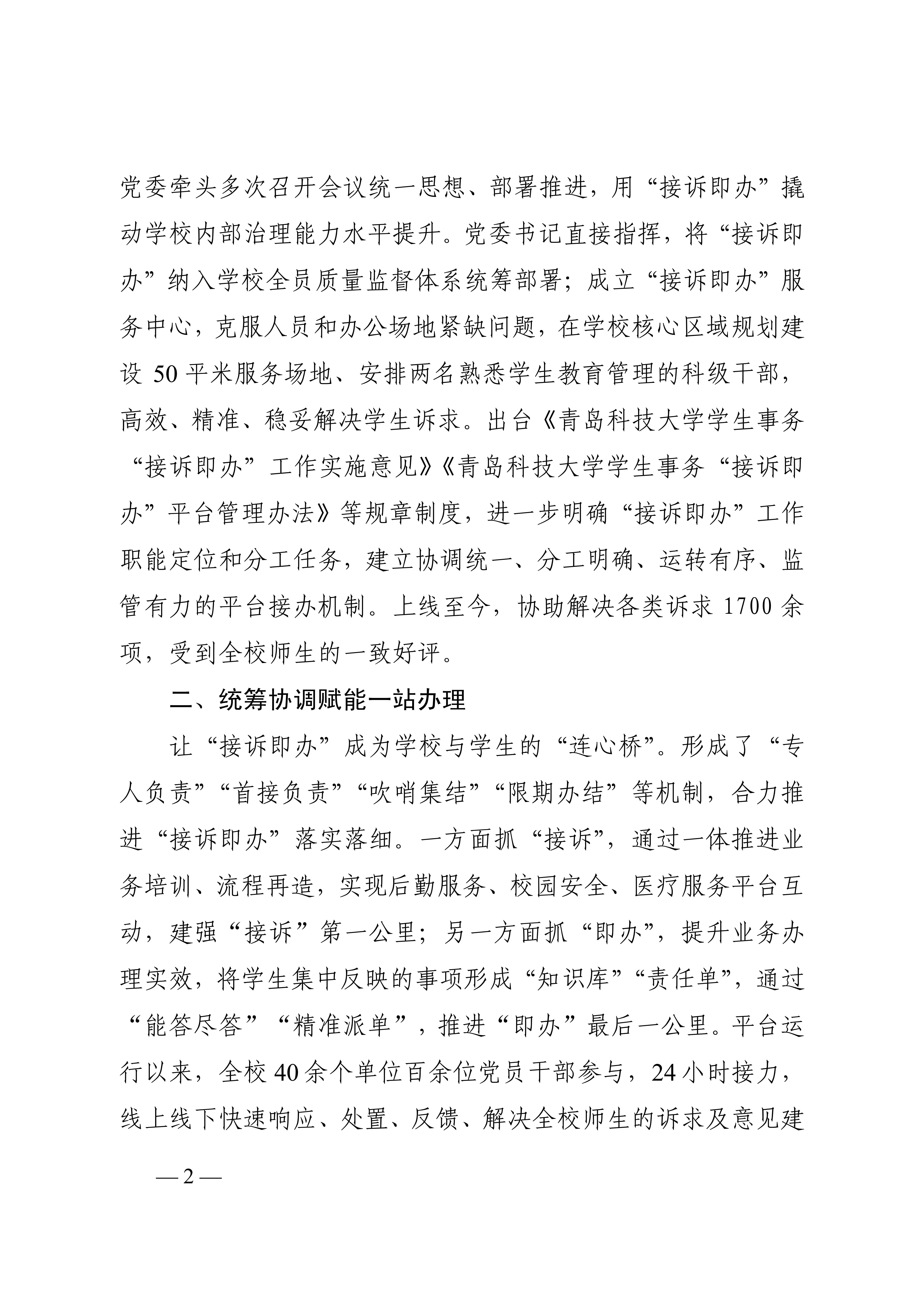 统筹协调赋能一站办理。让“接诉即办”成为学校与学生的 “连心桥”。形成了“专人负责”“首接负责”“吹哨集结”“限期办结”等机制,合力推进“接诉即办”落实落细。一方面抓“接诉”,通过一体推进业务培训、流程再造,实现后勤服务、校园安全、医疗服务平台互动,建强“接诉”第一公里;另一方面抓“即办”,提升业务办理实效,将学生集中反映的事项形成“知识库”“责任单”,通过“能答尽答”“精准派单”,推进“即办”最后一公里。平台运行以来,全校40余个单位百余位党员干部参与,24小时接力,线上线下快速响应、处置、反馈、解决全校师生的诉求及意见建议,切实解决好广大师生的操心事、烦心事、揪心事,让师生感受到了“青科速度”“青科温度”。