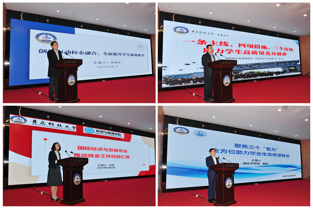 会上,信息学院院长刘国柱,高密校区党委副书记、管理委员会常务副主任张青山,经管学院国贸系教师任燕,高分子学院辅导员曲明依次作典型发言。四个单位从不同角度进行了工作交流,既有学院层面的总体规划与系统管理,又有业务老师和辅导员层面的精心指导与温情教育,是青科大教育工作者千方百计促就业、用情用心用力全员抓就业的缩影与写照。