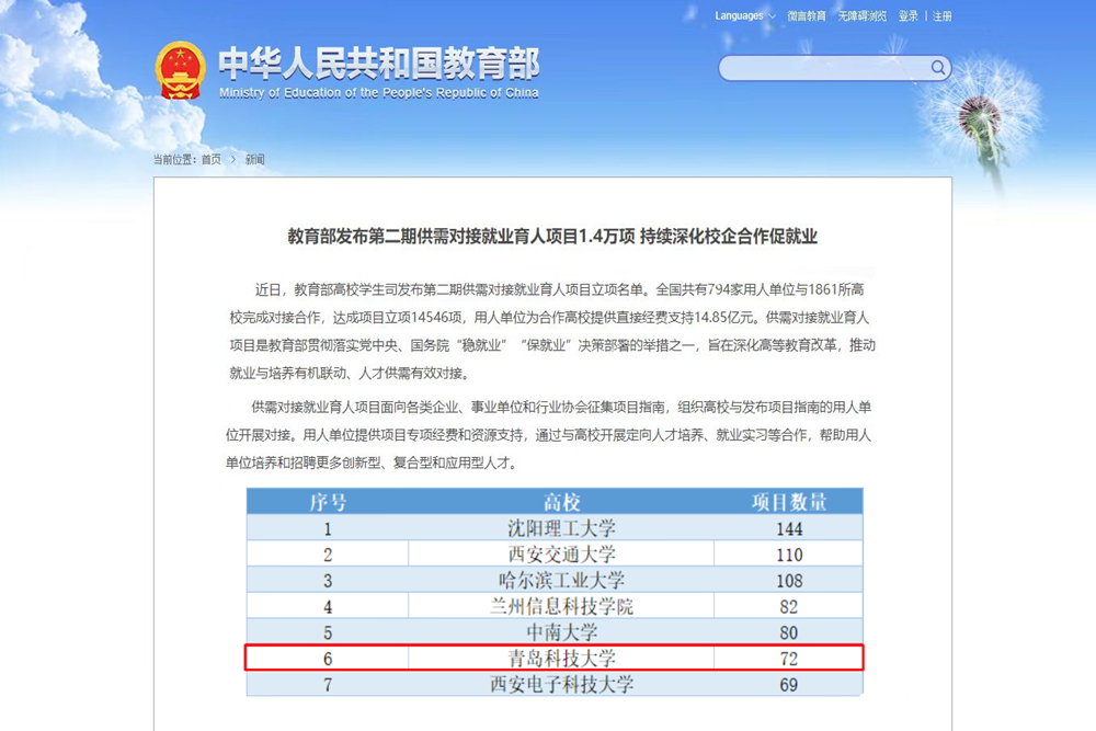 日前,教育部发布《关于公布第二期供需对接就业育人项目立项名单的通知》,学校与万华化学、海信集团、赛轮集团、歌尔股份、长城汽车、比亚迪等39个用人单位合作的72个供需对接就业育人项目获批立项,较2022年增加32项,增长82.5%,立项总数在全国立项成功的1861所高校中排名第6位,较2022年(首期)全国第8位前进2位,连续两年蝉联全省第一。