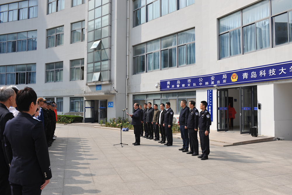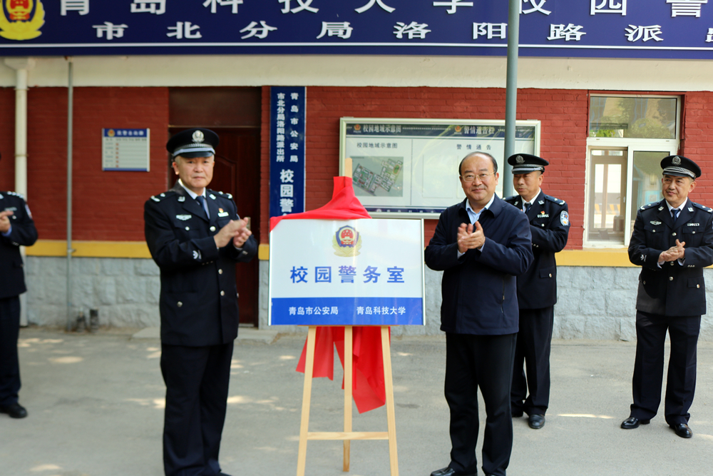 为进一步提升校园安全防控能力,学校牢固树立安全发展底线思维,借助公安专业力量,以校园警务室为载体,努力打造“校警高效联动”的校园安全治理模式,切实提高校警共建、护校安园的工作水平。5月9日和11日,学校分别联合青岛市公安局崂山分局、市北分局,在崂山、四方两校区举行了校园警务室揭牌仪式。崂山分局政委董良君、市公安局政保支队副支队长丁鼎、市北分局副局长张万青等公安干警分别受邀参加仪式,学校党委副书记李勇出席并讲话。仪式由保卫处处长王永波主持。
