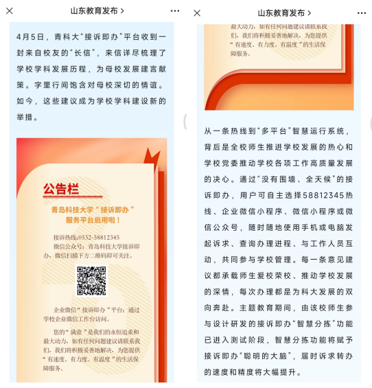 同日,《山东教育报》(总第1436期)头版刊发《青科大开启推动高质量发展的“双向奔赴”》一文,从“‘边察边办’推动机制升级”“‘智慧平台’推动运转升级”“‘未诉先办’推动效能升级”三方面对学校“接诉即办”工作成效和特色做法进行了详细介绍。
