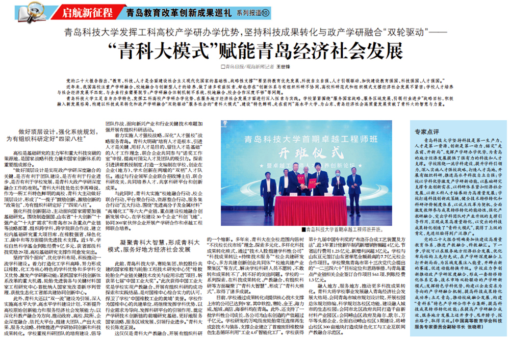 5月22日,《青岛日报》第5版以《365完美体育发挥工科高校产学研办学优势,坚持科技成果转化与政产学研融合“双轮驱动”——“青科大模式”赋能青岛经济社会发展》为题报道了学校第七届青岛市教育改革创新奖获奖成果。