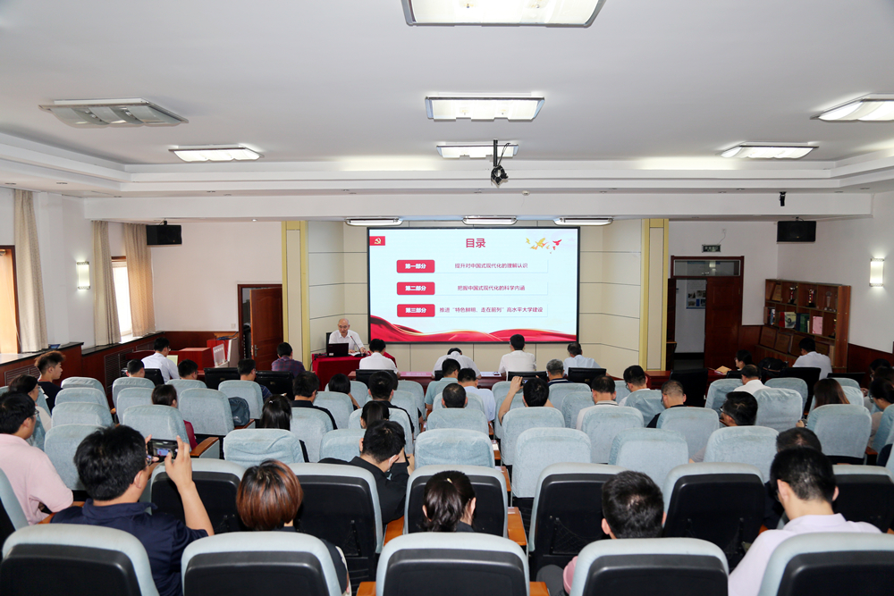 陈克正以《深刻领悟“中国式现代化”丰富内涵,加快推进“特色鲜明、走在前列”高水平大学建设》为题,从主题教育的总要求和根本任务出发,结合学校实际,围绕深刻把握习近平新时代中国特色社会主义思想的世界观和方法论,从“提升对中国式现代化的理解认识”“把握中国式现代化的科学内涵”“推进‘特色鲜明、走在前列’高水平大学建设”三个方面,对推进中国式现代化和推动学校各项事业高质量发展进行深入阐述。他强调,开展学习贯彻习近平新时代中国特色社会主义思想主题教育,是贯彻落实党的二十大精神,全面落实立德树人根本任务的重大举措,高分子学院要坚定创优信心,彰显专业特色,打造以橡胶为特色的先进高分子材料学科高峰,开展有组织拔尖创新人才培养、有组织科研创新、有组织服务国家和区域经济社会发展,踔厉奋发、攻坚克难、重点突破,奋力推动“六个新跃升”,不断开创学校以学科建设为引领的高质量发展新局面。