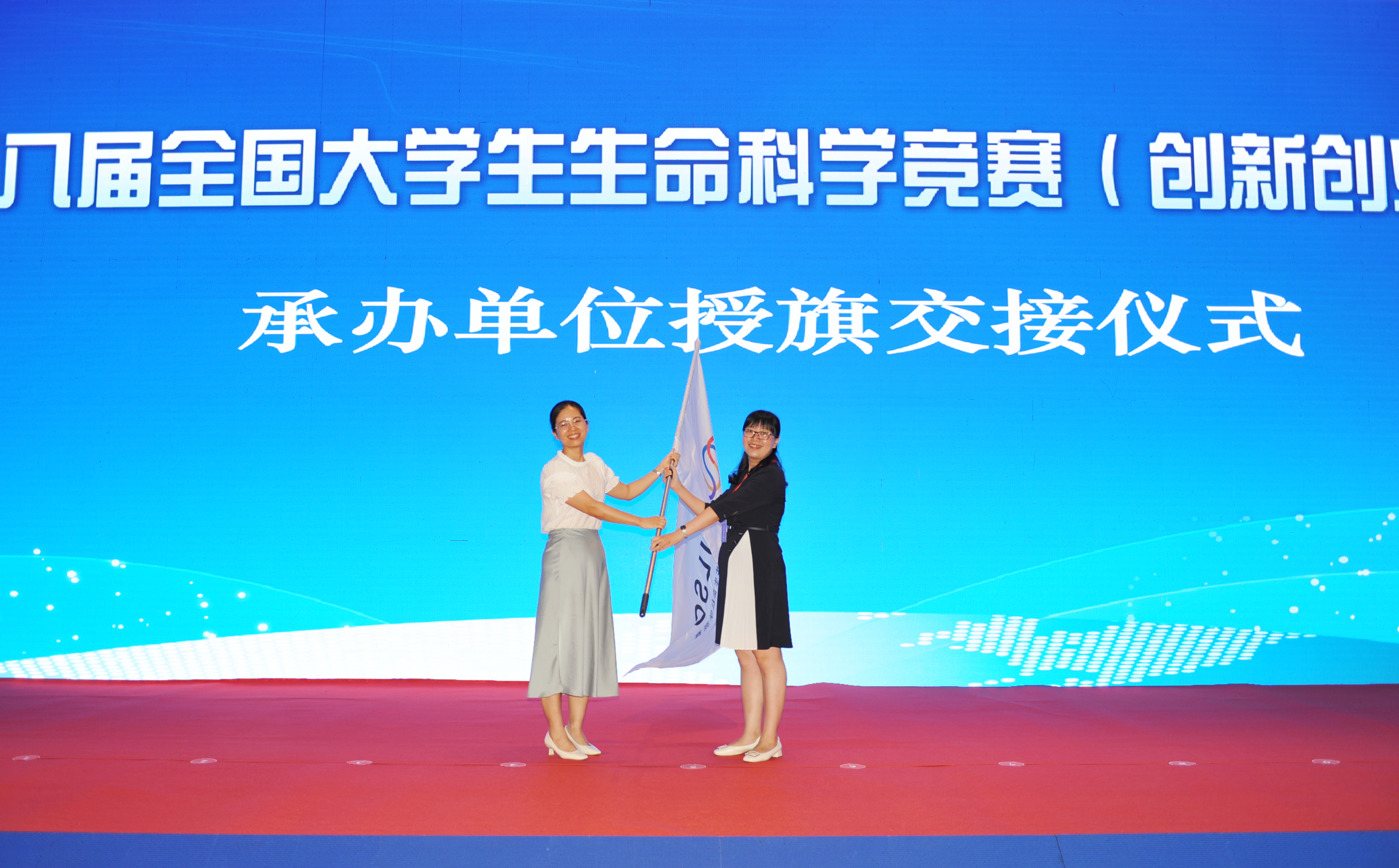 张雪洪宣布西华大学为第九届全国大学生生命科学竞赛(创新创业类)承办高校;365完美化工学院党委书记孙明媚向下一届承办单位交授会旗;第九届大赛承办单位代表、西华大学食品与生物工程学院院长唐洁致辞。