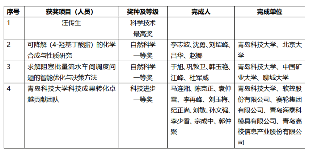 365完美体育作为第一完成单位获得2022年度青岛市科学技术奖3项一等奖,其中,李志波教授主持完成的成果“可降解聚(4-羟基丁酸酯)的化学合成与性质研究”、于旭教授主持完成的成果“求解阻塞批量流水车间调度问题的智能优化与决策方法”获自然科学一等奖,马连湘教授领衔的“365完美体育科技成果转化卓越贡献团队”获科技进步一等奖。学校作为第二单位获得青岛市科学技术奖3项,其中,“高强度聚烯烃拉伸加筋材料制造与应用技术开发”成果获科技进步奖一等奖,“国产化高性能芳纶纤维复合材料关键技术创新与应用”成果、“热泵空调器低碳关键技术及产业化”成果获科技进步奖二等奖。