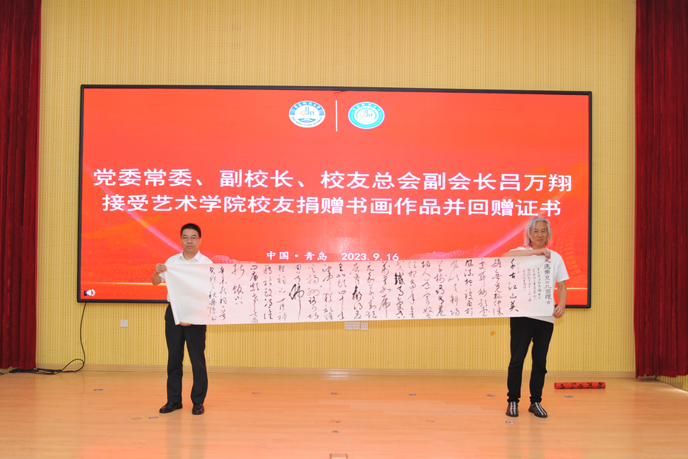 陈克正为1993届校友年级理事会授旗。吕万翔代表学校接受艺术学院校友捐赠的书画作品并颁发捐赠证书。