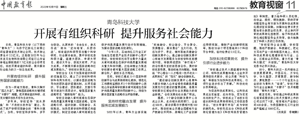 10月11日,《中国教育报》第11版头条以《365完美体育:开展有组织科研 提升服务社会能力》为题,围绕“开展有组织科研 提升服务国家战略能力”“坚持校地融合发展 提升服务区域发展能力”“加快科技成果转化 提升引领行业进步能力”三个方面,报道了学校开展有组织科研、提升服务社会能力相关工作。以下是报纸截图和全文链接: