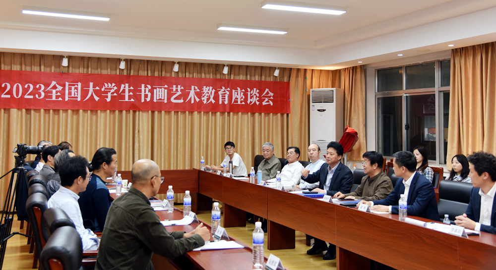 10月31日下午,召开了大学生书画教育座谈会。李宏文致欢迎辞,李冰作总结发言,杨利汇报了学校传承大书法工作的情况及青岛艺术产业学院建设情况,梁秀介绍了中国硬笔书法协会情况及举办全国大学生书画作品年展的情况,中国硬笔书法协会理事、天津师范大学教授顿子斌等高校代表分别从大学生书画教育现状、课程设置、人才培养、实习实践、书画作品年展等方面发言。与会嘉宾围绕当前大学生书画教育现状进行了深入的探讨,分享经验。中央美术学院学生卓拉等各高校学生代表参加座谈。