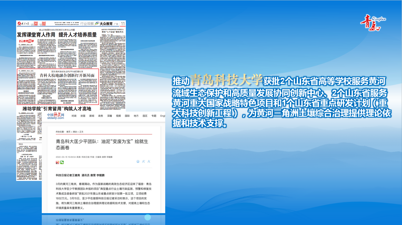 一是搭建服务平台,提升服务国家战略能力。实施主动融入黄河流域生态保护和高质量发展行动计划,获批2个省高校服务黄河流域生态保护和高质量发展协同创新中心、2个省服务黄河重大国家战略特色项目、1个省重点研发计划项目,建设石化行业工矿场地生态修复产业技术创新中心,为黄河三角洲土壤综合治理提供理论技术支撑。