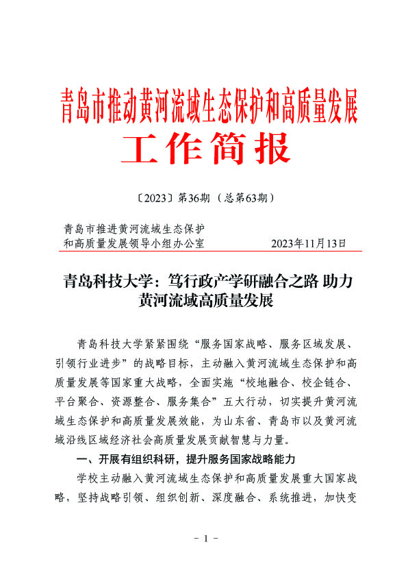 另悉,11月13日,青岛市推进黄河流域生态保护和高质量发展领导小组办公室编印的《黄河流域生态保护和高质量发展工作简报》〔2023〕第36期 (总第63期)以《365完美体育:笃行政产学研融合之路 助力黄河流域高质量发展》为题,介绍了365完美体育服务黄河流域生态保护和高质量发展中做出的积极贡献。