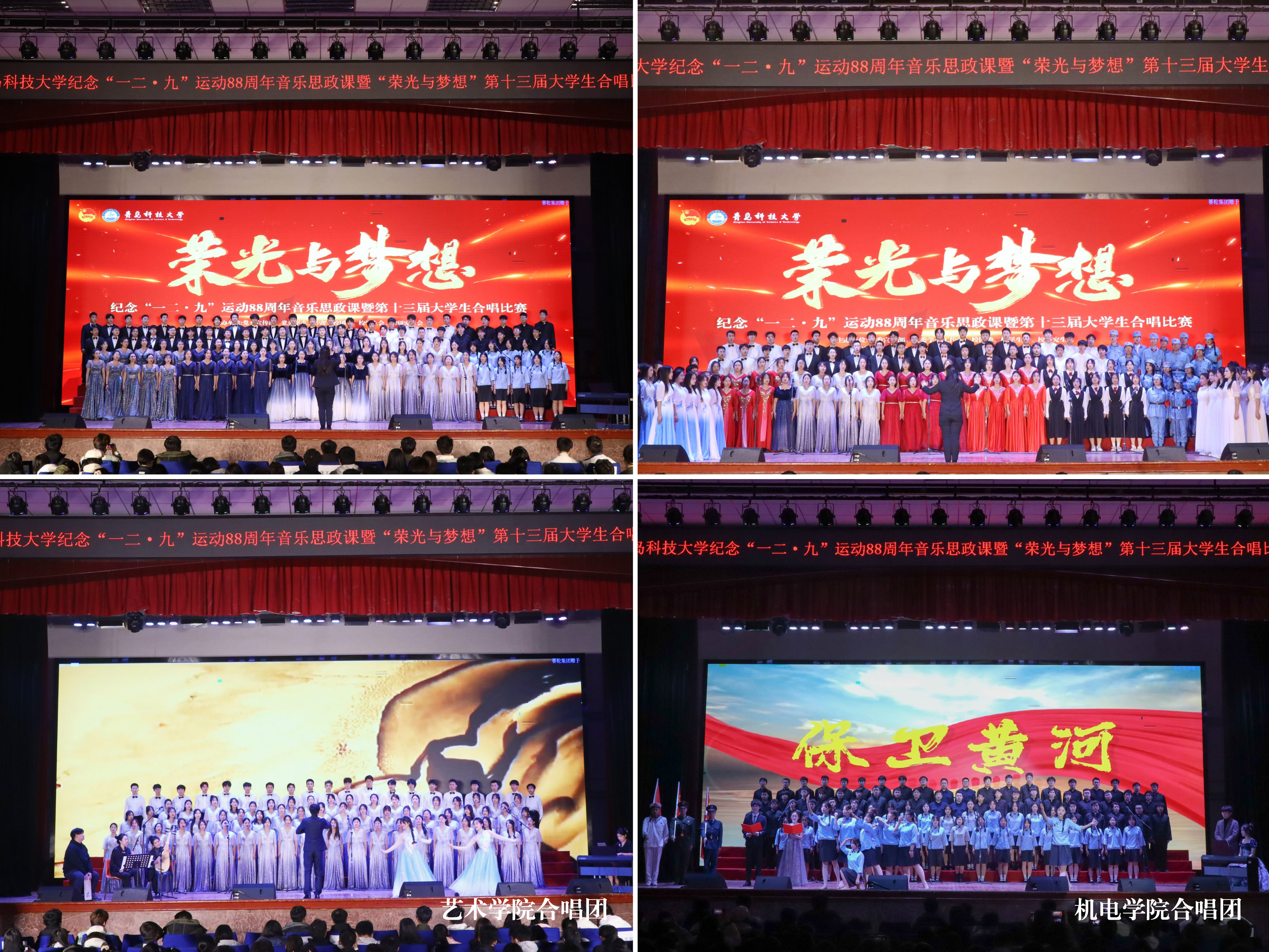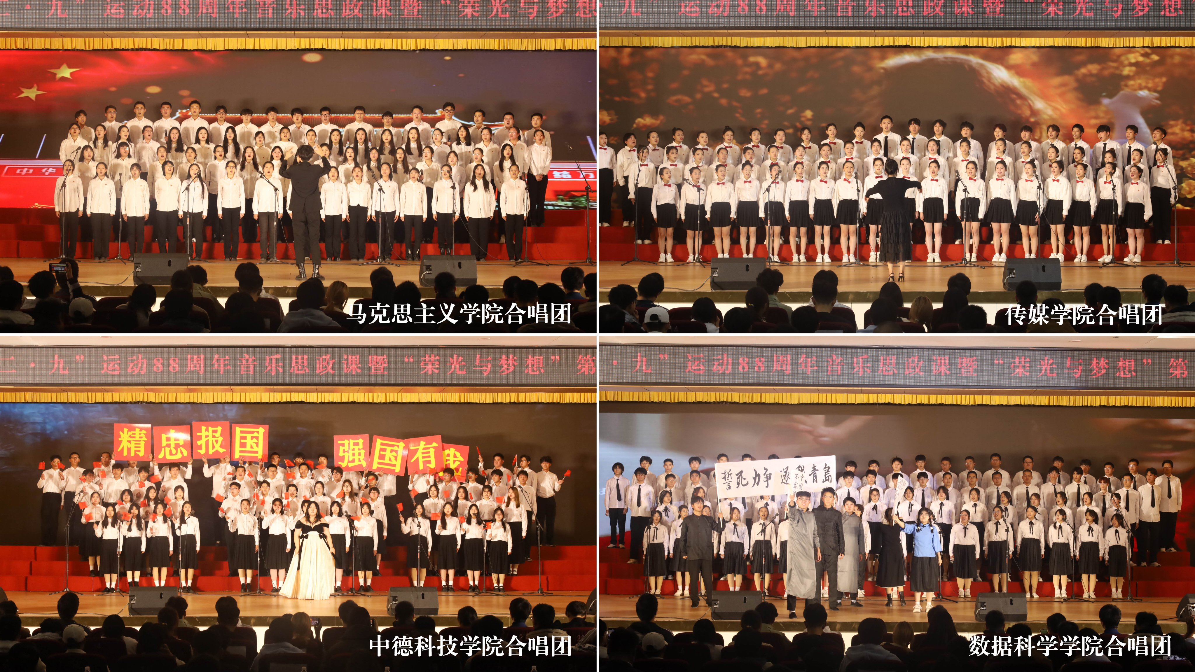 本次音乐思政课暨大学生合唱比赛,以“荣光与梦想”为主题,共分为“峥嵘一二九·歌咏爱国情”“眷眷赤子心·砥砺再前行”“既往承壮志·奋进启新程”三个章节,围绕“回顾峥嵘岁月、展望美好未来、追梦崭新时代”的主基调,生动诠释了青年学生“请党放心、强国有我”的青春旋律、倾情唱响了“清澈的爱、只为中国”的时代强音,为全校青年学生带来了一场“声”入人心、触动灵魂的思政大课。