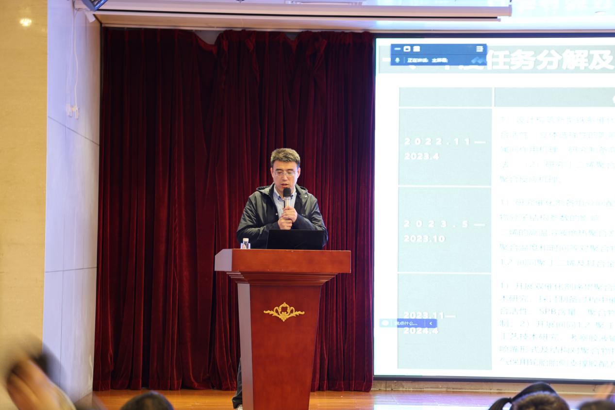 贺爱华教授汇报了“反式丁戊橡胶制备关键技术和应用研究”课题的研究进展与成果。团队设计了新型反式丁戊橡胶催化剂,催化活性提高近4倍,反式含量≥94%;制备了不同结晶度TBIR;对千吨级工业中试装置优化及工艺探索;完成耐高温橡胶关节应用评价,70℃疲劳寿命提高一倍以上;申请发明专利8件;发表论文9篇。