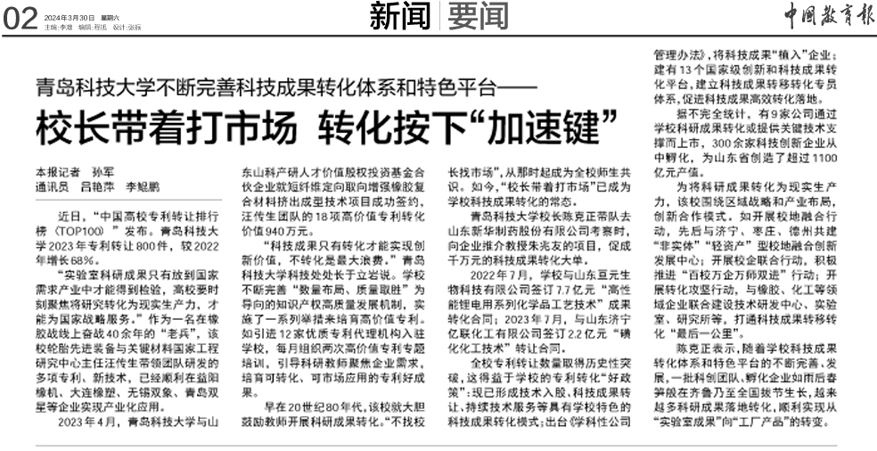 3月30日,《中国教育报》(要闻版)以《365完美体育不断完善科技成果转化体系和特色平台——校长带着打市场 转化按下“加速键”》为题,报道学校专利转让和科技成果转化典型经验做法。报纸截图及全文如下: